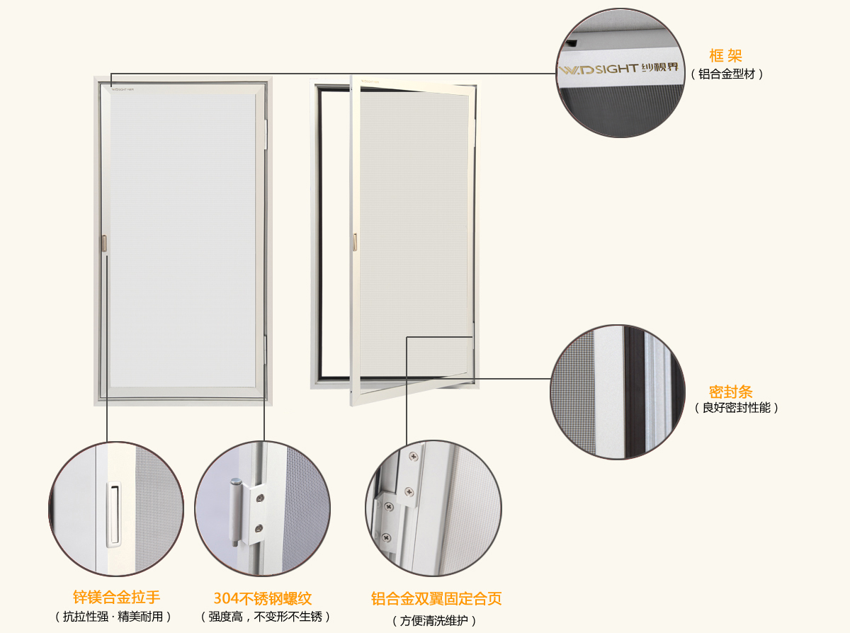 鋁合金雙翼固定合頁(yè):可使紗窗自由開(kāi)啟、關(guān)閉和拆卸,方便清洗維護(hù),達(dá)到室內(nèi)外互通,