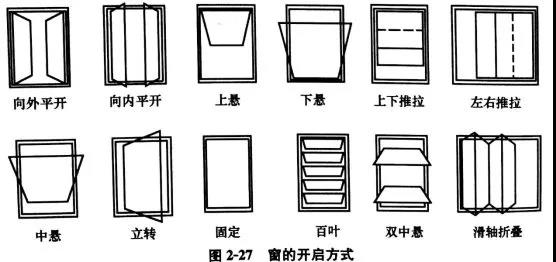 窗按所用材料不同,分為木窗、鋼窗、鋁合金窗、鋁塑窗、塑鋼窗等;按開啟方式,可分為平開窗、中懸窗、上懸窗、下懸窗、立式轉窗、水平推拉窗、垂直推拉窗、百葉窗、隔音保溫窗、固定窗、防火窗、櫥窗、防射線觀察窗等,見下圖。