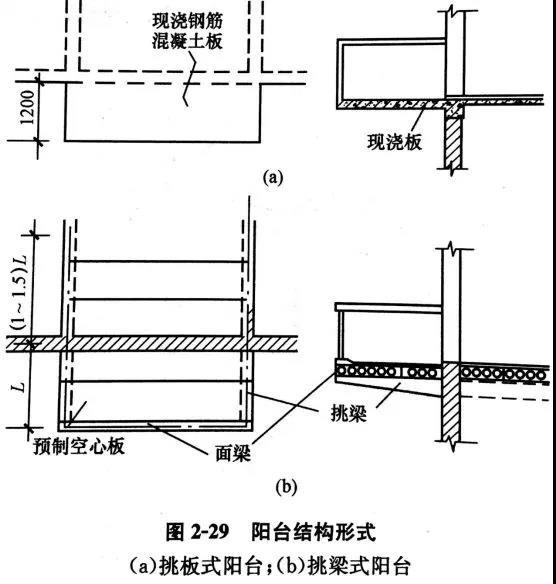 陽臺形式很多,在使用方面,有生活陽臺、服務陽臺。生活陽臺供生活起居之用,服務陽臺為從事家務活動等用。而陽臺結構形式有挑板式陽臺和挑梁式陽臺兩種,見下圖。